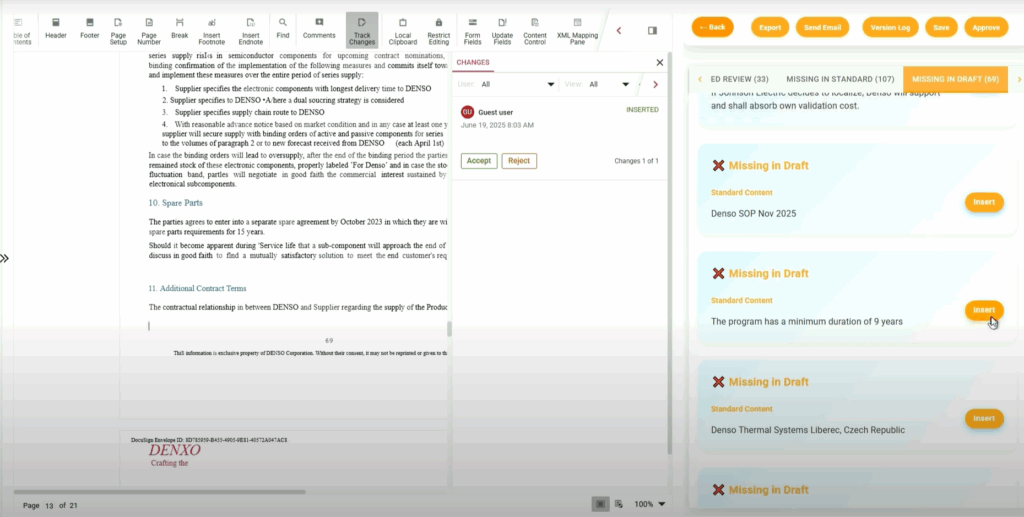 Automate deviation detection, get instant clause recommendations from your AI-driven clause library, edit & redline in a built-in contract editor, track every version, route approvals seamlessly, and sign – all from one streamlined legal workflow dashboard.